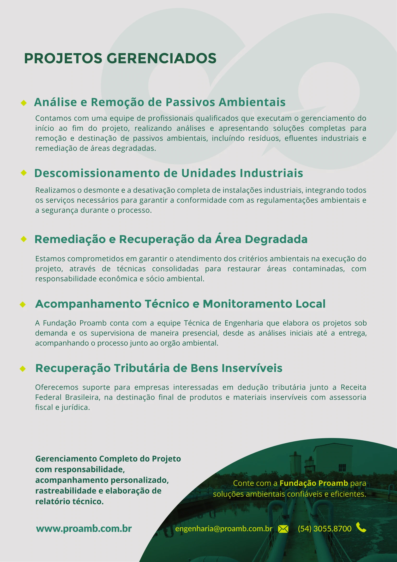 A gestão ambiental é um diferencial que permite às empresas se dedicarem ao que mais sabem fazer, produzir. Com o serviço de Engenharia, a Proamb realiza o acompanhamento total dos negócios, desde o surgimento até o seu pleno funcionamento, garantindo uma operação alinhada à legislação ambiental.